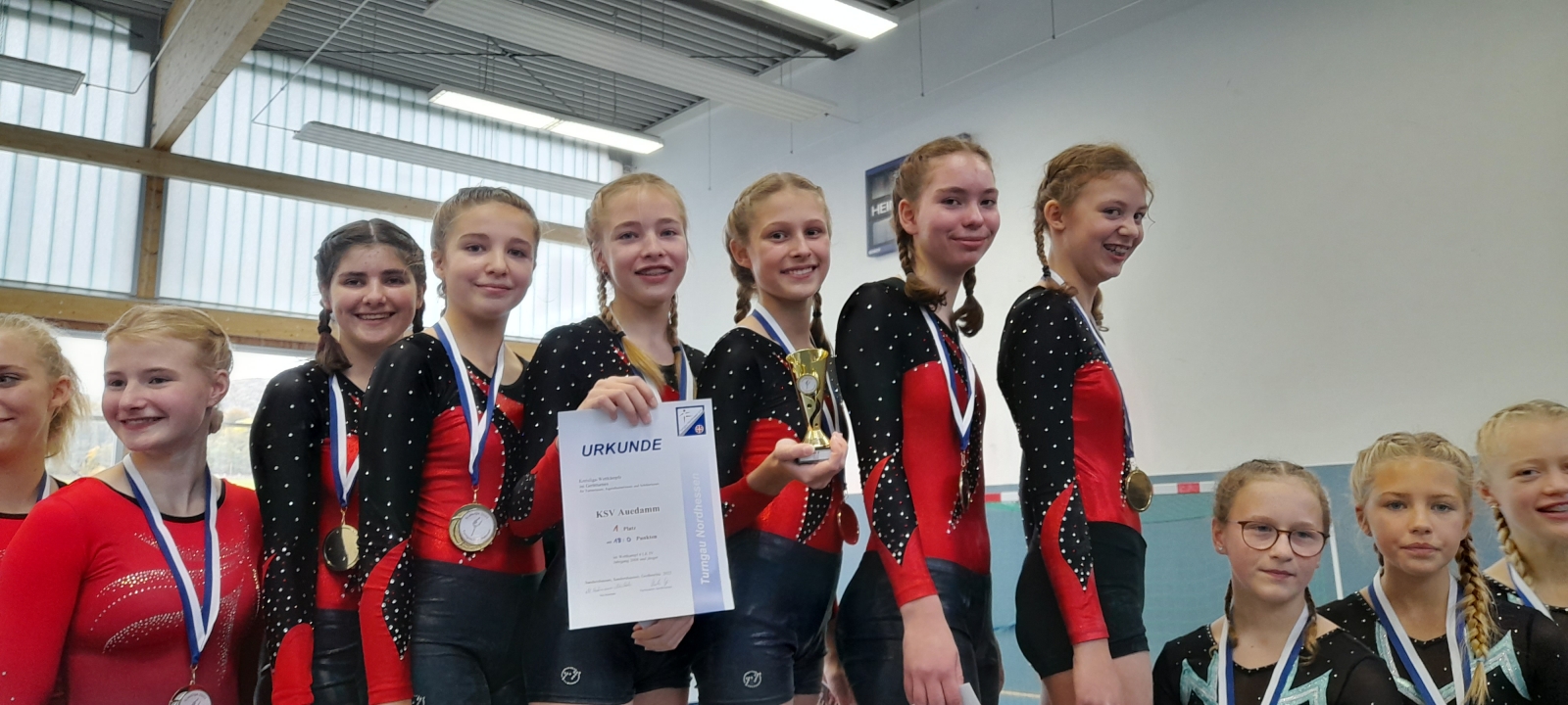 Mit 5 Teams ging die KSV Auedamm an den Start und die Jüngsten in der P4 - Nora, Carlotta, Lara, Anieke, Tiana und Nele - mussten sich einem starken FTSV Heckershausen geschlagen geben, sie turnten sich auf den 2. Platz. Noch erfolgreicher schnitten ihre Vereinskameradinnen der P5 - Marie, Sophia, Frida Liv, Fiona, Ella und Aenna- ab, sie sicherten sich ungefährdet den ersten Platz und damit die Qualifikation.