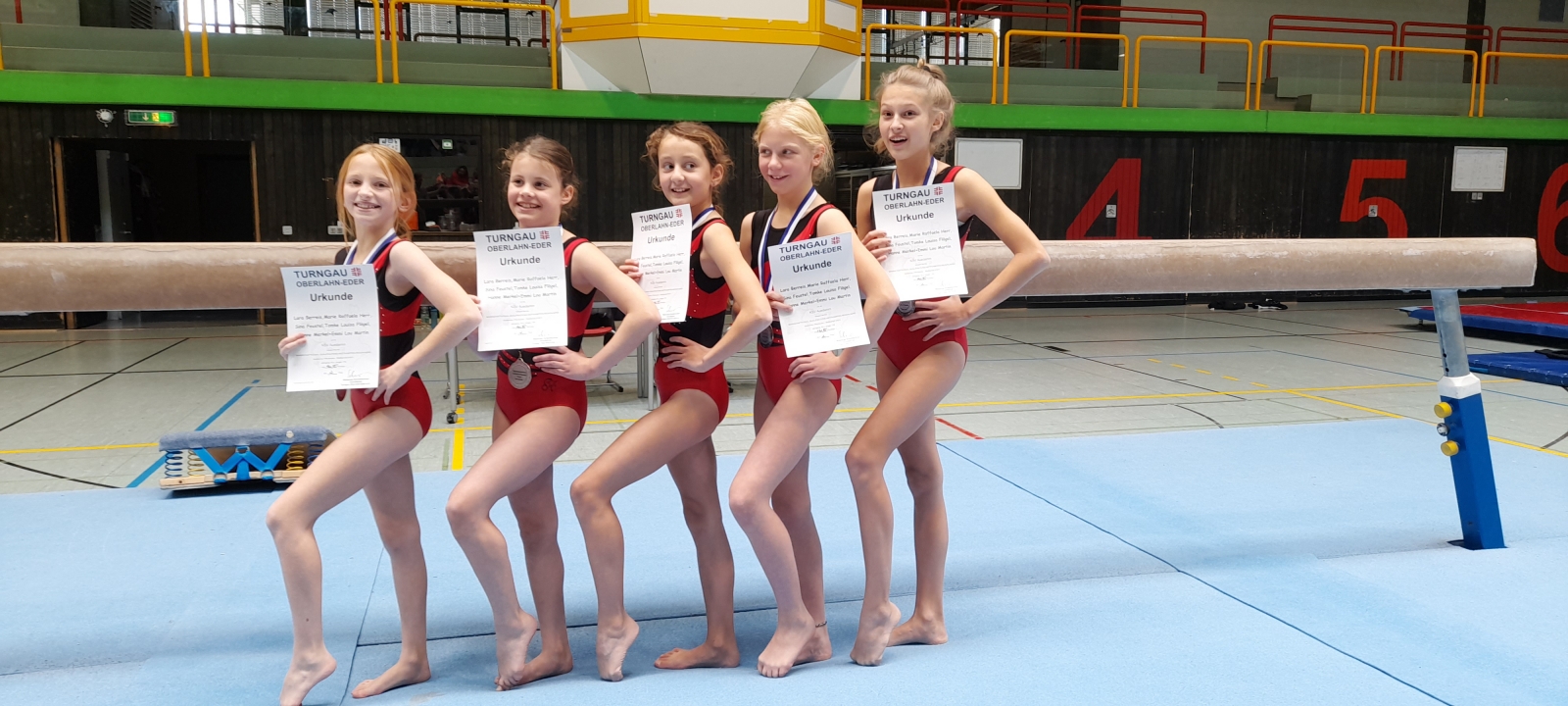 Gleich morgens demonstrierte die LK4 mit Sina, Tomke, Marie, Hanne, Lara und Malina ihr Können und legte gleich am ersten Gerät, dem Schwebebalken, die Weichen für den Sieg. Mit 143,95 Pkt. belegten sie Rang 1 vor der KTV Obere Lahn, 139,55 Pkt und qualifizierten sich damit für das Hessische Mannschafts-Landesfinale im November.