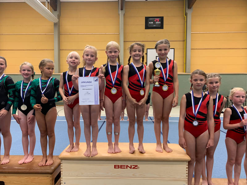 Gleich nach den Sommerferien mussten die Turnerinnen bereits wieder in die Wettkampfsaison einsteigen und sich innerhalb weniger Trainingsstunden auf die Gau-Mannschafts-Meisterschaften vorbereiten. Der Wettkampf am 17. September in Heckershausen war gleichzeitig die Qualifikation für den Regionalentscheid Anfang Oktober. Mit 5 Teams ging die KSV Auedamm an den Start und die Jüngsten in der P4 - Nora, Carlotta, Lara, Anieke, Tiana und Nele - mussten sich einem starken FTSV Heckershausen geschlagen geben, sie turnten sich auf den 2. Platz.